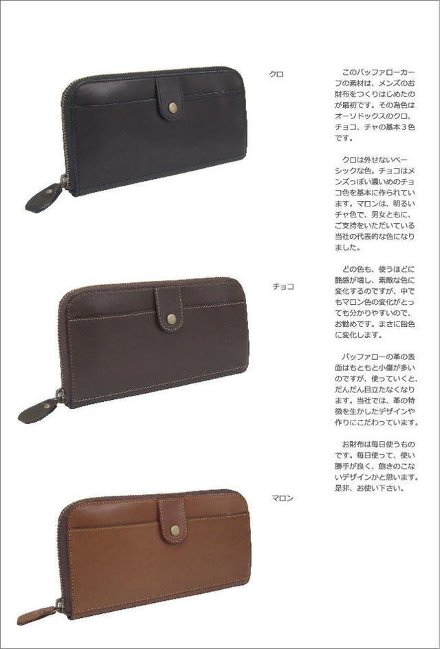 素材・・・バッファローカーフ サイズ・・H20×W10×D2cm 重さ・・・155g 仕様・・・カード入れ8 札入れ2 フリースペース2 小銭スペース1 外ポケット1 *小銭入れはファスナー開閉革を使い込む愉しみを ダイレクトに感じられる逸品